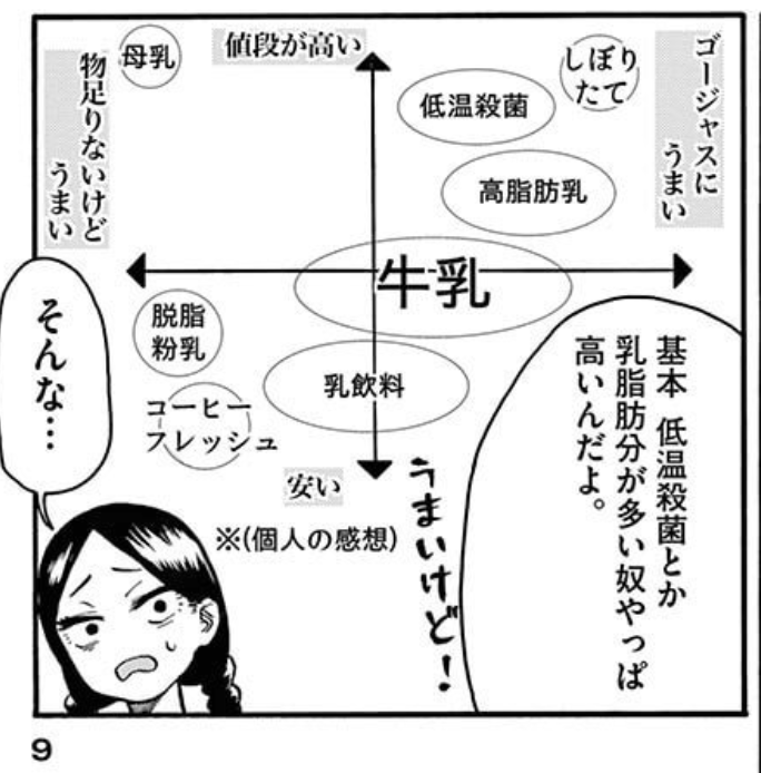 これは拙作置きにいったアンという読切で作った牛乳味グラフです。もう十年近く前の読切だからグラフ作り直したいかもしれない。新しい漫画でやりたい…今だと殺菌方法で全然味違うという話と牛によっての味の違いの話をしたいですね…